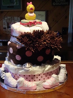 Earlier that week, my friend Jessica came over to help me make a diaper cake for the event. Her little sister had a baby boy and Jessica made an amazing cake, so I asked for her help. We ended up using 72 diapers, a blanket, and more.